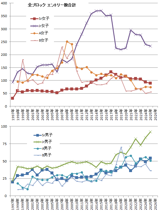 正確には連盟の競技者登録名簿を見れば分かるのでしょうが、一般には公開されていないので、年間の国内試合結果から出場した全選手のリストを作成して分析しました。(2005年の銀盤では連盟登録2000人と記載がある) 基本的にWEB上で公開された情報を元に集計していますので、結果の公開されない試合(小さな地方大会や、学生の新人戦、パピオカップ、りんスポ杯など)にしか出ていない人は含まれません。 ・宮杯とマスターズ大会はWEB上では非公開ですが、会場でプログラムを入手して集計に含めています ・ダンスやマスターズのみで級の不明な人は便宜上「初級以下」に分類しました ・「試合に出た選手」なので、連盟登録しているだけの人は当然含まれていません 【注】: この数字はあくまで個人的に集計した参考データですので、公式資料に基く物ではありません。個々のデータや クラブ人数の数字も含めて「引用」することは構いませんが、その場合は出典(引用元)の明記をお願いします。 1997年からこれまで27年間で2258の国内試合データ(2025年6月7日時点、延べ参加人数23.7万人)から個別に識別した選手数は19,055人(その内、すでに引退した人は15,568人)になっています。 地方大会のデータも揃った2000-2001シーズン以降の5年間は、現役の選手総数は約2,000人と一定で、各級の内訳もほぼ同じ数値を保っていたのですが、その後の'05-06シーズン以降では毎年300人ペースで急に増加傾向を示し、'09-10シーズンにはついに3,500人を超えてほぼ倍の数に達しました。 競技人口が急増しているのに対し、リンクの数は増えるどころか逆に減っているので、クラブの選手数(特に常設リンクに付随する大きなクラブ)は急激に膨張しており、練習環境は日々悪くなっているのが現実。 → 日本各地のスケートリンク状況と、地域別のスケートクラブ人数の推移の「東京・神奈川」の項目を参照 特に首都圏の民間リンクはスケート教室でさえ入会するのに退会する人を待っている状態で、退会待ちの予約まで一杯になっている所もあるほど。'09-10シーズンはついにリンク事情の悪化で新しく始める人が減少したのか、増加傾向は一旦頭打ちとなりましたが、リンクは増加しておらず厳しい現状は変わりません。 2015年からさらに一段増加して4500人を超えましたが2019年に若干減少し、2020春の新型コロナ騒動以降は4000人を切って選手数は低下傾向になっています。 (このページ内のコンテンツ一覧) 1、現役選手数推移(級別) 2、地域別の選手数 (選手権クラスと全選手数) の推移 3、地域別のリンク数の推移 4、地域別のリンク当りの選手数推移 5、選手の大会デビューから引退まで 6、国内主要大会の参加者数推移一覧 注:ブラウザのキャッシュが残っていると古いグラフのデータが表示されることがあります。キーボードの”Ctrl+F5”で強制再読み込みを推奨。 ●現役競技人口 (プロや外国籍を除く、試合にエントリーした人) の推移 ※連盟登録人数ではなく、無登録や趣味の人も含む試合に名前が出た人の数です ![]() (カウントのルール) ・試合の「教室級」は数えるがエキシビや発表会は除外 ・その年度最後の出場試合までで級を認定する ・試合の出場級が明確な場合は級が確定するが、幅があるクラス(例えば2007年以前の女子Nv-Bは3級以上)では最も低い級と推測する。より高い級のクラスに出場していればそれを採用する よって、ノービス選手ではジュニアに上がるまで級が不明な場合があり、本当は6級以上でも結果的に4級や5級と推測される事もある。 古くはノービスBは3級以上だったのですが、'08-09シーズンから女子はBが4級以上になり、さらに'09-10シーズンから女子ノービスAも5級以上に、 '10-11シーズンからはさらに女子ノービスAは6級以上、Bも5級以上になっています。 それによって、ノービスクラスでの出場者の推測級が上がると共に、実際に出場資格のために級を取る必要が生じたことで、5級と6級の人数比率が近年は急激に上昇する傾向が見られます。 ・7級はずっと変化なかったが2010以降増加開始し 2014シーズンでついに300人を超えました ・6級も2009より急に増加し以後は最多数に ・5級は少数派から2009-10シーズンに急増、その後も数を維持 ・4級も2008-09に急増したが、2010-11シーズン以降は減少 ・3級は2007年急増後やや減少し、2015年に再び増加後は飽和 ・2級以下は近年2倍以上に増加したが、その後は飽和傾向 休止(その年度の記録がないが、その後再出場する人)を含めた現役合計の数は2009年で増加が停止していたが、2014年から再び増え始め、2015年には初めて合計で4000人を超えました。その後増加は2016年で一旦止まり、2018年にはやや減少しました。 これが一時的な現象かどうかが注目されましたが、'19-20シーズンは新型コロナの影響で春の大会が軒並み中止となり、春にデビューするはずの人や宮杯、マスターズの大人の人など700人程がカウントされず急激な減少となってしまいました。その後も大会中止や規模縮小で試合に出ら